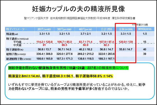 WHOの基準(最低基準)は、正常値・標準値として理解されている場合があり、精子が少ない運動率が悪いことを異常だと認識していない場合があるようです。
